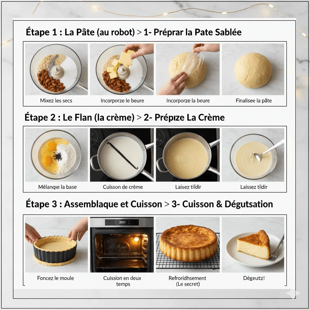 Je me souviens encore de la première fois où j’ai préparé ce flan avec un robot : la crème était d’une onctuosité parfaite, la pâte savoureuse grâce aux amandes, et le résultat a littéralement bluffé toute la famille. Plus sophistiqué qu’un flan traditionnel, il reste accessible grâce à une méthode simplifiée au robot pâtissier. La pâte aux amandes apporte un croustillant et une saveur noisettée irrésistible qui contraste magnifiquement avec la douceur vanillée du flan.