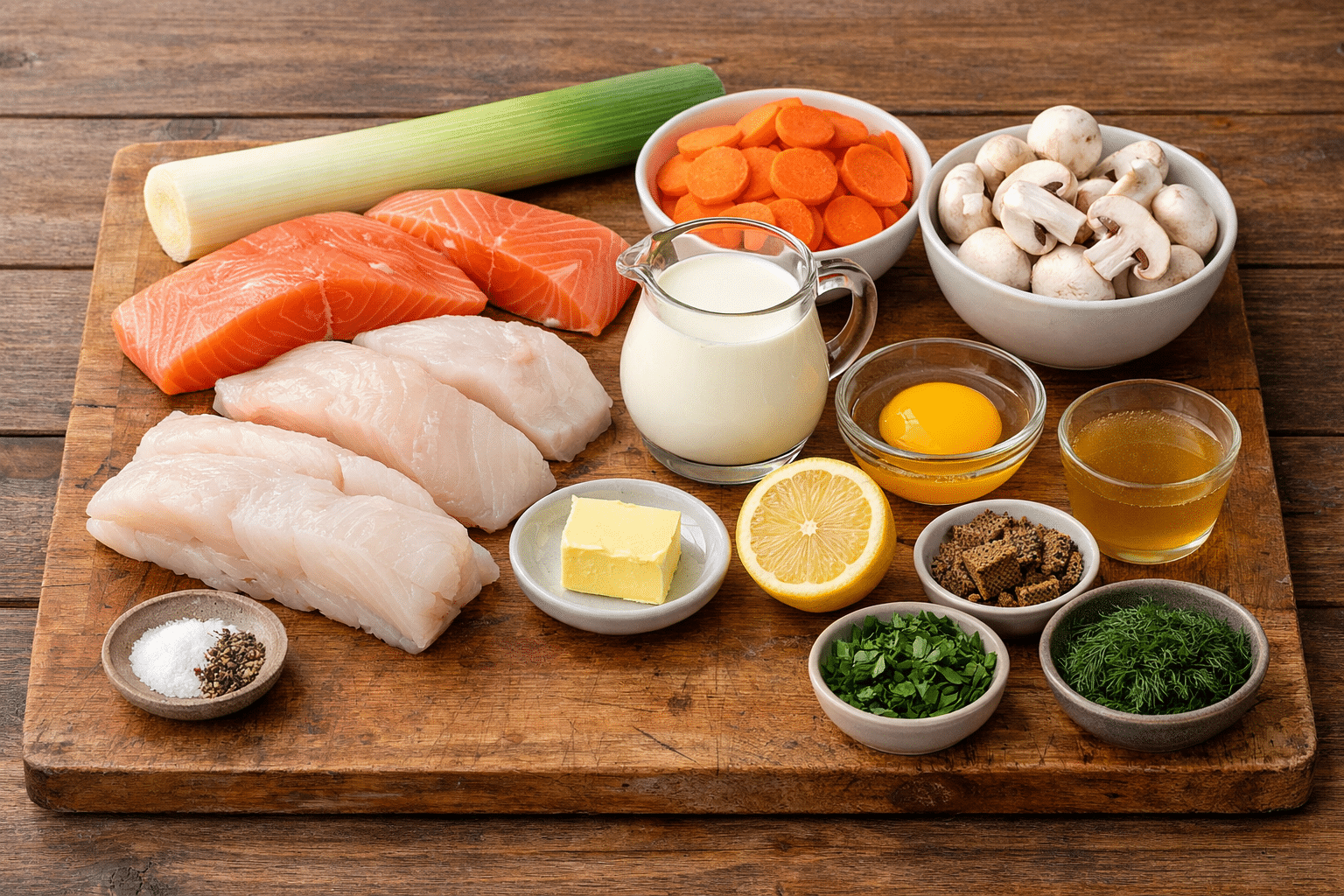 - 300 g de filets de poisson blanc : Cabillaud, colin ou lotte pour une chair plus ferme et fine.