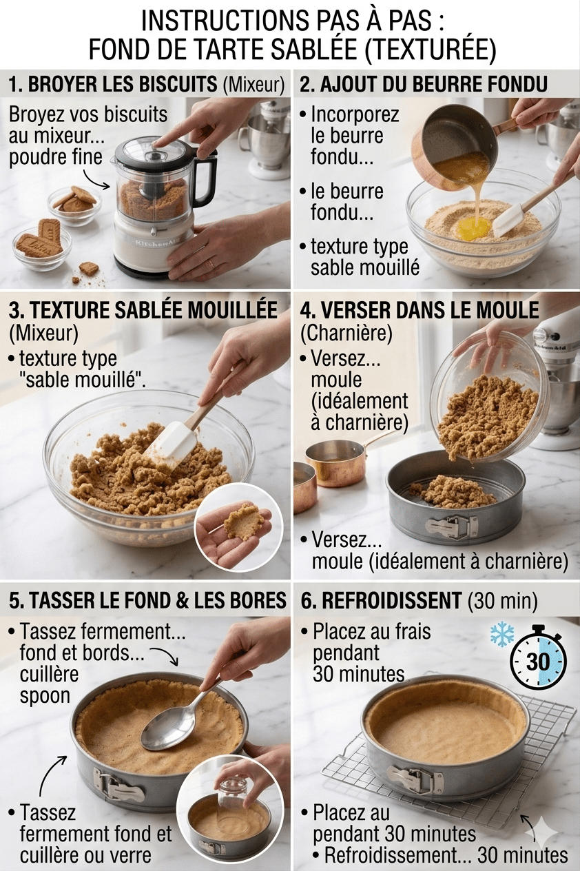 Broyez vos biscuits (au mixeur ou au rouleau) jusqu’à obtenir une poudre fine. Incorporez le beurre fondu et mélangez pour obtenir une texture type “sable mouillé”.