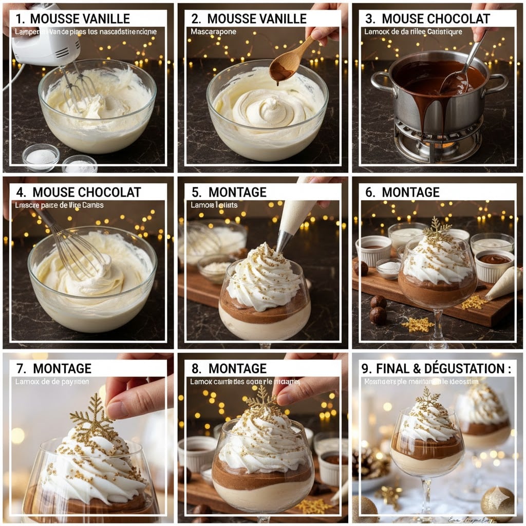 Mon aventure culinaire a commencé par un défi : créer des desserts de fête qui soient à la fois élégants et sans stress après les longs repas. Ces Verrines de Noël sucrées sont le résultat de cette quête de l’équilibre parfait entre le spectacle visuel et la facilité d’exécution. L’idée de la mousse bicolore vanille-chocolat est un clin d’œil aux desserts classiques d’enfance, mais présentée dans un format moderne et individuel. C’est la recette que je dégaine chaque année quand je n’ai pas le temps de monter une bûche, mais que je veux tout de même offrir un final gourmand et raffiné. Elles incarnent la générosité des fêtes sans l’effort démesuré.